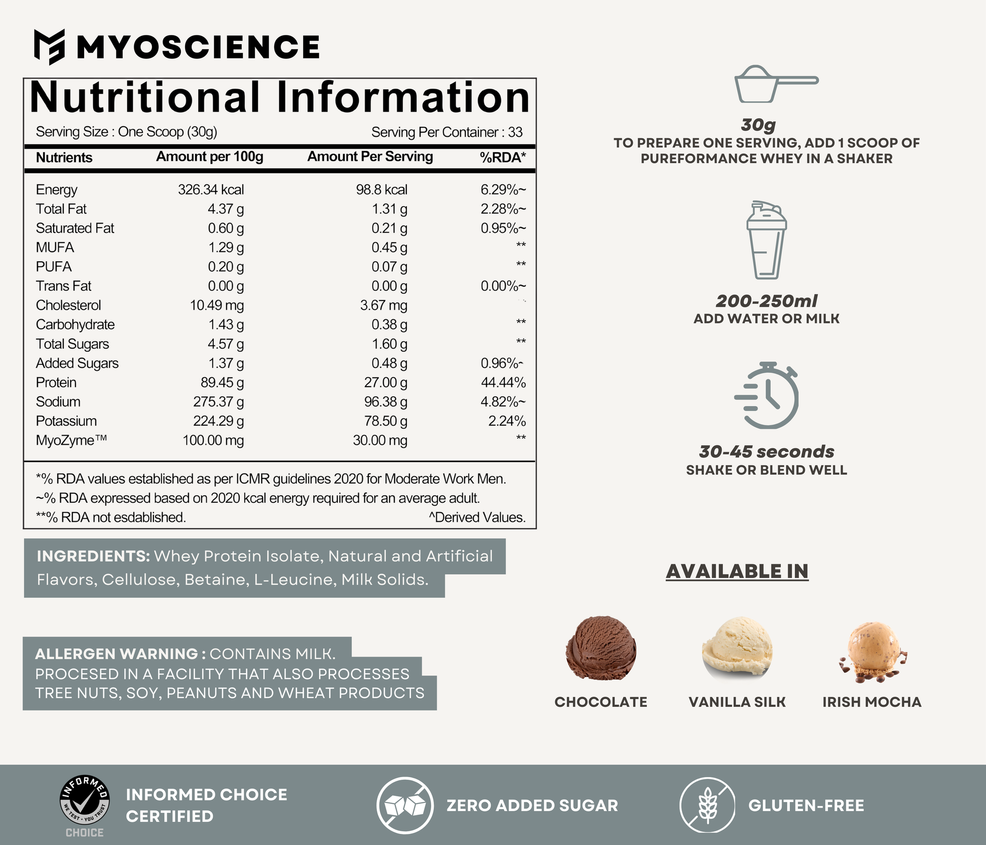 - Mix 1 scoop (approx. 30g) of Pureformance Whey Protein