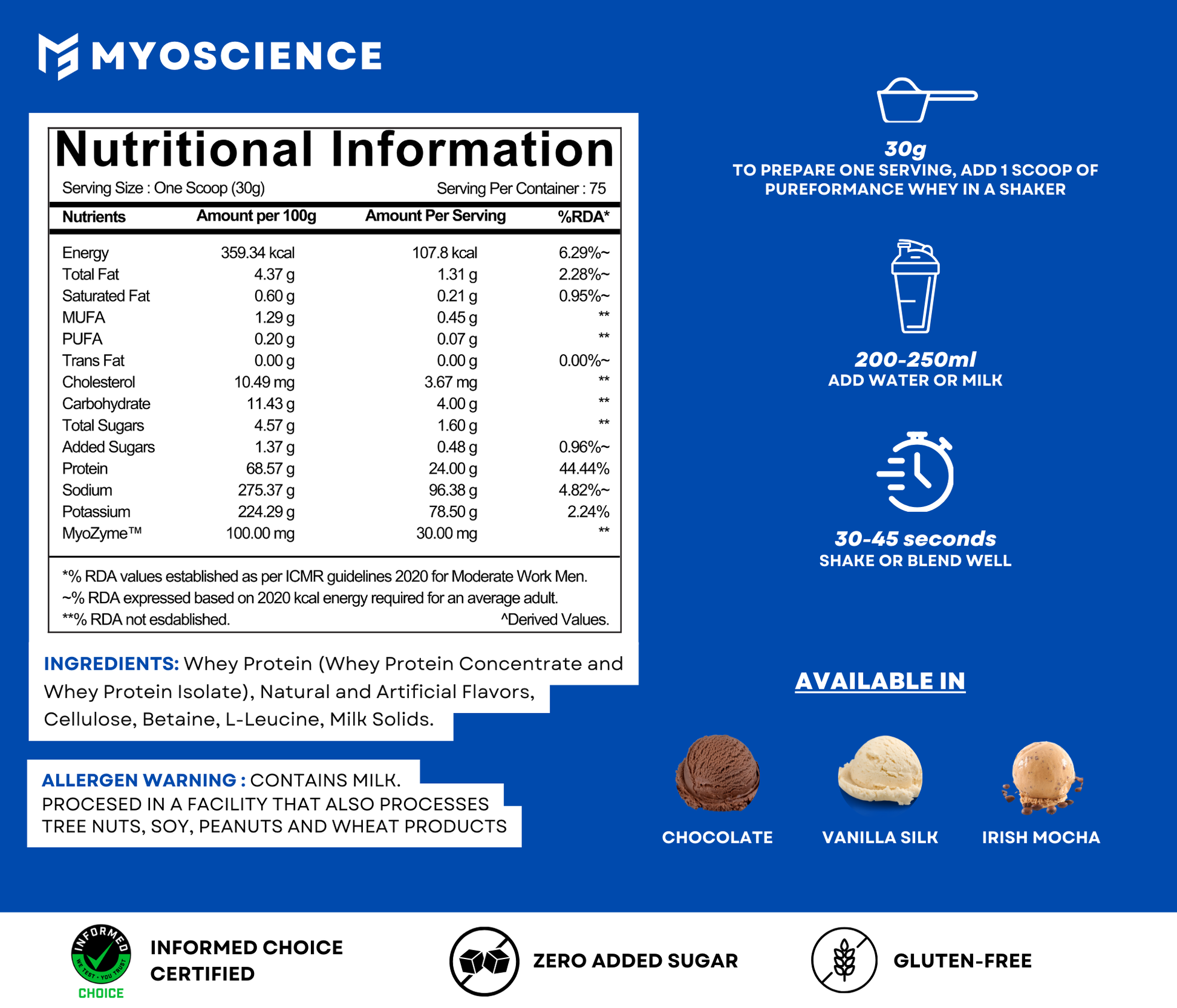 - Mix 1 scoop (approx. 30g) of Pureformance Whey Protein
